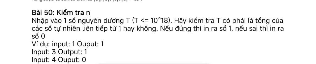 `-` Với `n_1` thì ta chỉ cần xét `sqrt(1 + 8k)` có là `1` số lẻ hay không, vì `-1 + sqrt(1 + 8K)` với `sqrt(1+8k)` là số lẻ thì khi `-1` nó chắc chắn là số chẵn.