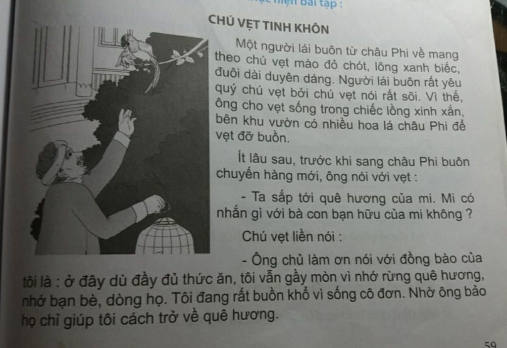 Một người lái buôn từ châu Phi về mang theo chú vẹt màu đỏ,lông xanh biếc và nói rất sõi. Ông cho vẹt sống trong chiếc lồng xinh xắn,bên khu vườn có nhiều hoa lá châu Phi để vẹt đỡ buồn.