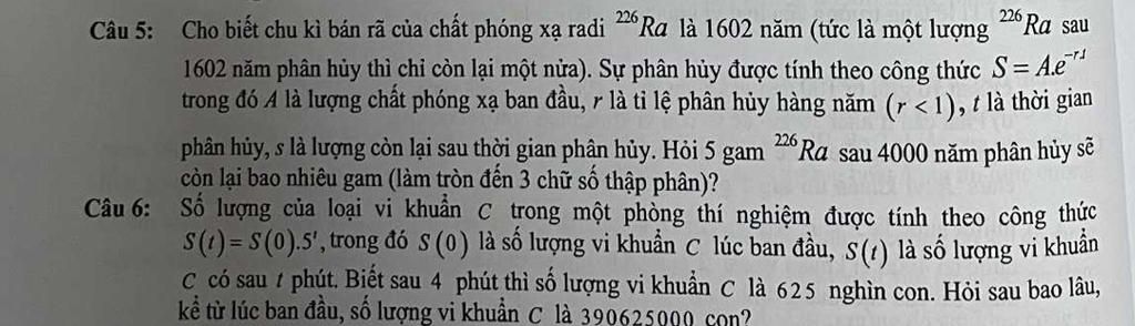 & \text{Giả thiết: } T = 1602 \text{ năm}, S = A.e^{-rt}, A = 5 \text{ gam}, t = 4000 \text{ năm}. \text{ Tính } S. \\