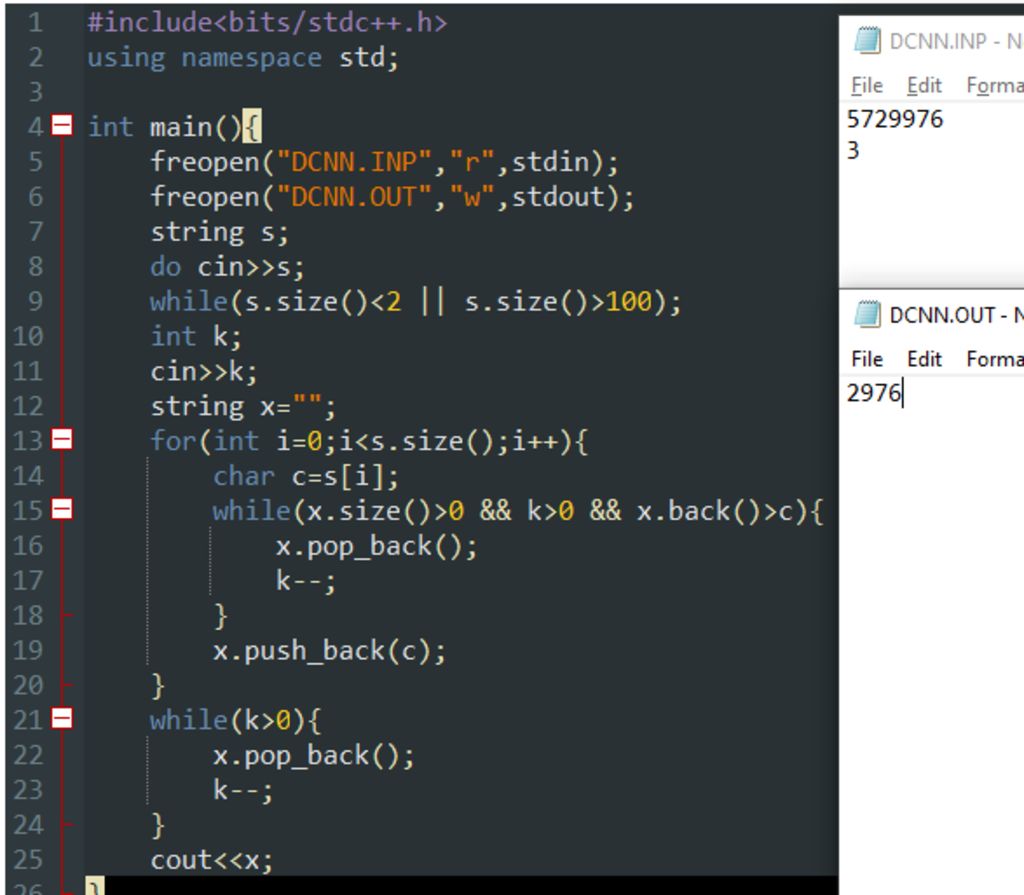 Yêu cầu: Hãy viết chương trình xóa k ký tự trong xâu S, để còn lại một xâu là số tự nhiên có giá trị nhỏ nhất.