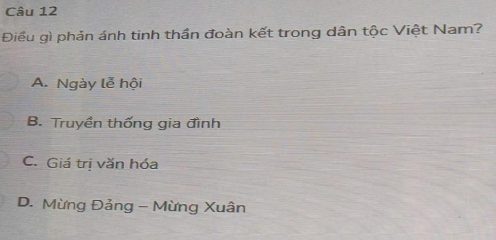 Đáp án phản ánh tinh thần đoàn kết trong dân tộc Việt Nam là: