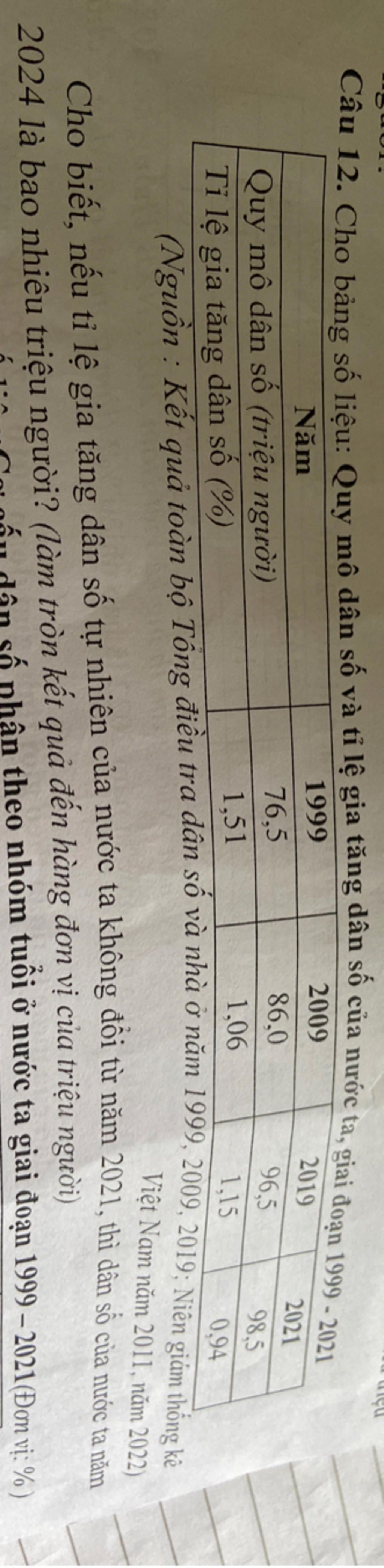 `+ P_2024 = 98,5 xx ( 1 + 0,0094 )^3 ≈ 101` ( triệu người )