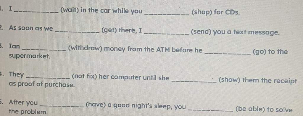 1.will have been waiting/ are shopping 2.get/will send 3.was going to withdraw/went 4.wouldn't fix/ showed 5.have had/ will be able😭, trời đất, gv mới sửa đáp án cho tui, chấn động quá😭