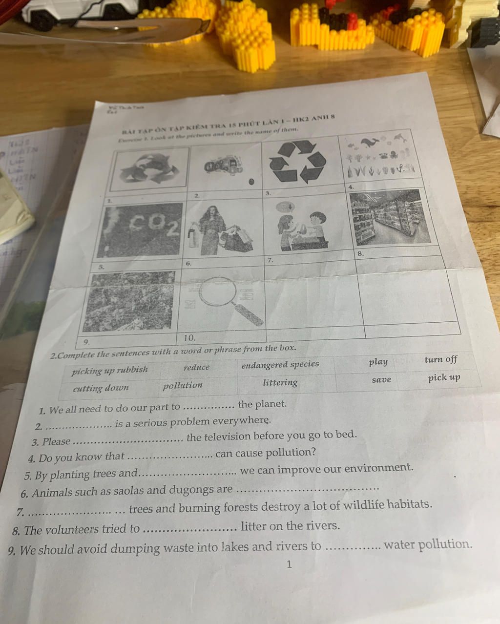 picking up rubbish – reduce – endangered species – play – turn off – cutting down – pollution – littering – save – pick up