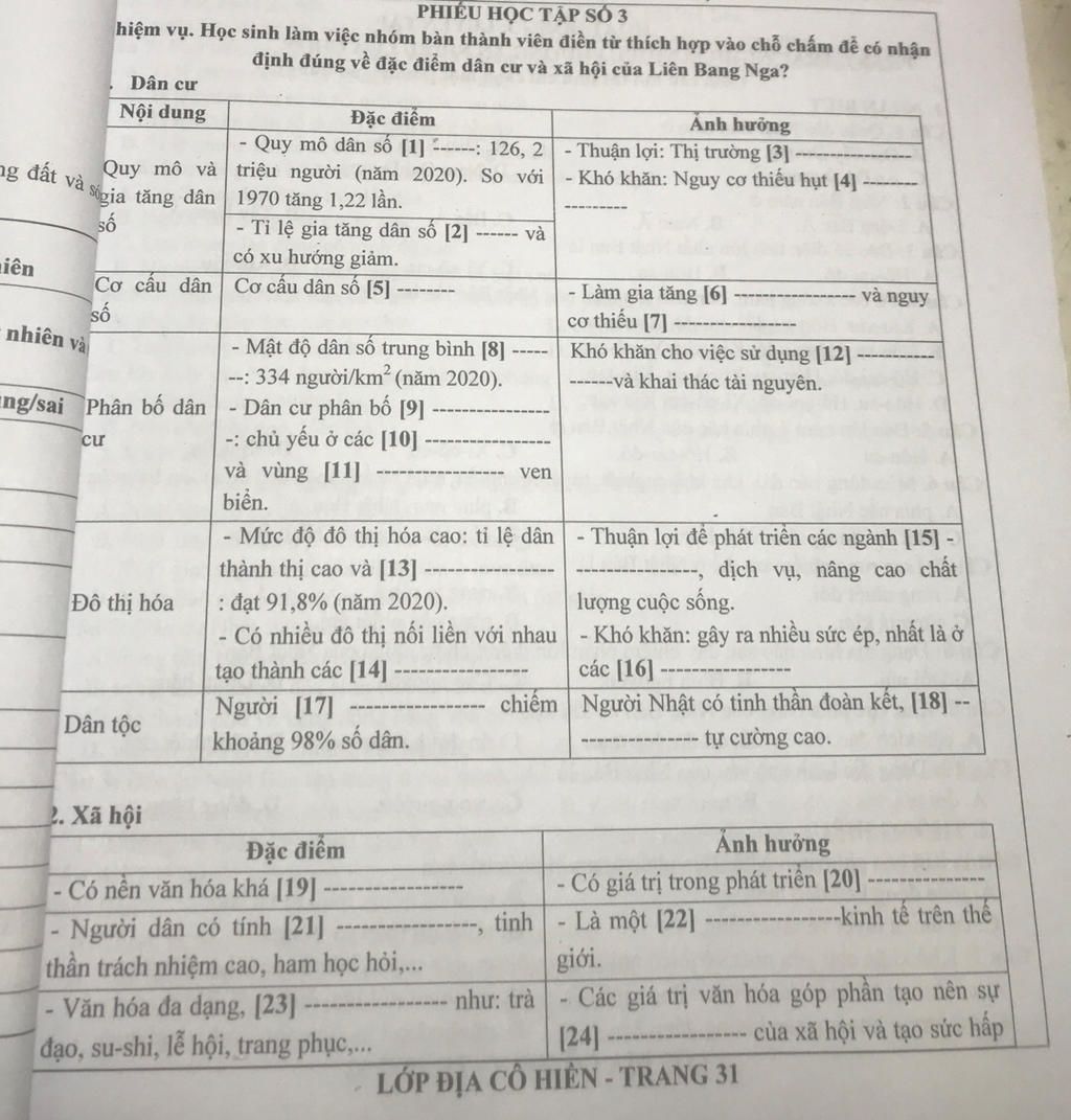 1. Dân cưNội dung Đặc điểmẢnh hưởngQuy mô và gia tăng dân số- Quy mô dân số [1] lớn: 126,2 triệu người (năm 2020). So với 1970 tăng 1,22 lần.