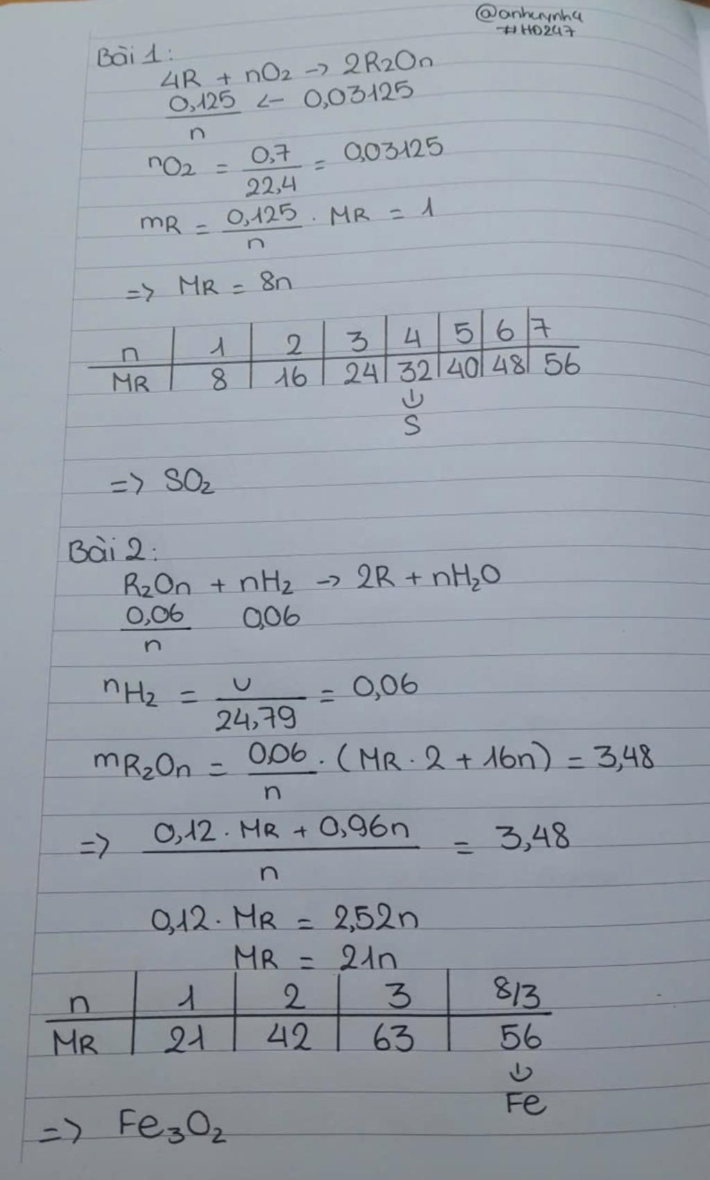 Theo PTHH: `n_(R) = n_(O_2) . 4/n = (0,03125 . 4)/n = 0,125/n`