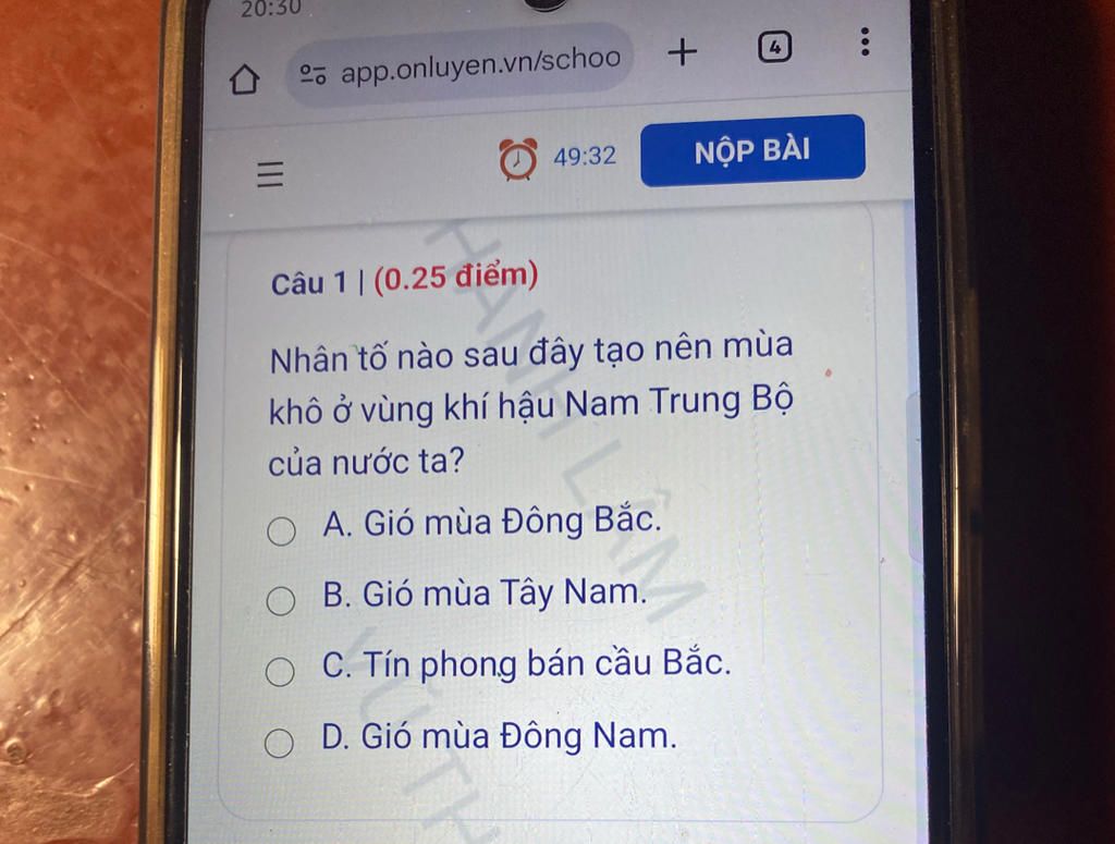 `-` Loại gió này khô, ít mưa, bị dãy Trường Sơn chắn`to` gây mùa khô rõ rệt.
