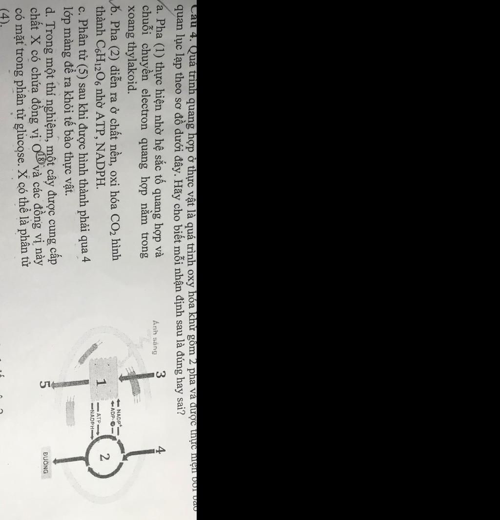 `-`Khi cung cấp nước có chứa đồng vị `O^{18}`, nguyên tử `O^{18}` này sẽ giải phóng vào phân tử `O_2` (số 5) thông qua quá trình quang phân ly nước, chứ không nằm trong phân tử glucose