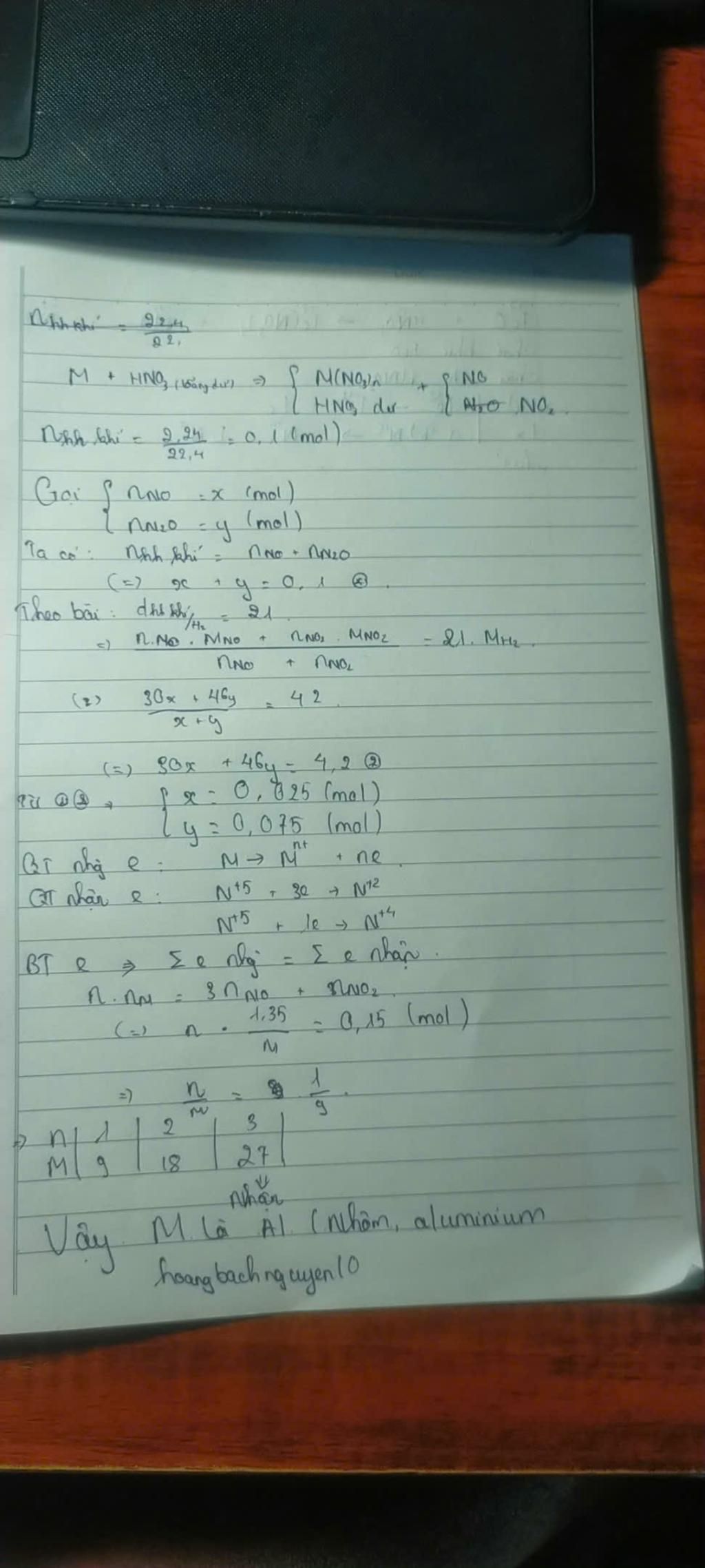 Hòa tan 1,35 gam một kim loại M bằng dung dịch HNO3 loãng dư thu được 2,24 lít hỗn hợp khíNO và NO2 (đktc) có tỉ khối hơi so với hidro bằng 21 (không có sản phẩm khử khác). Kim loại M là