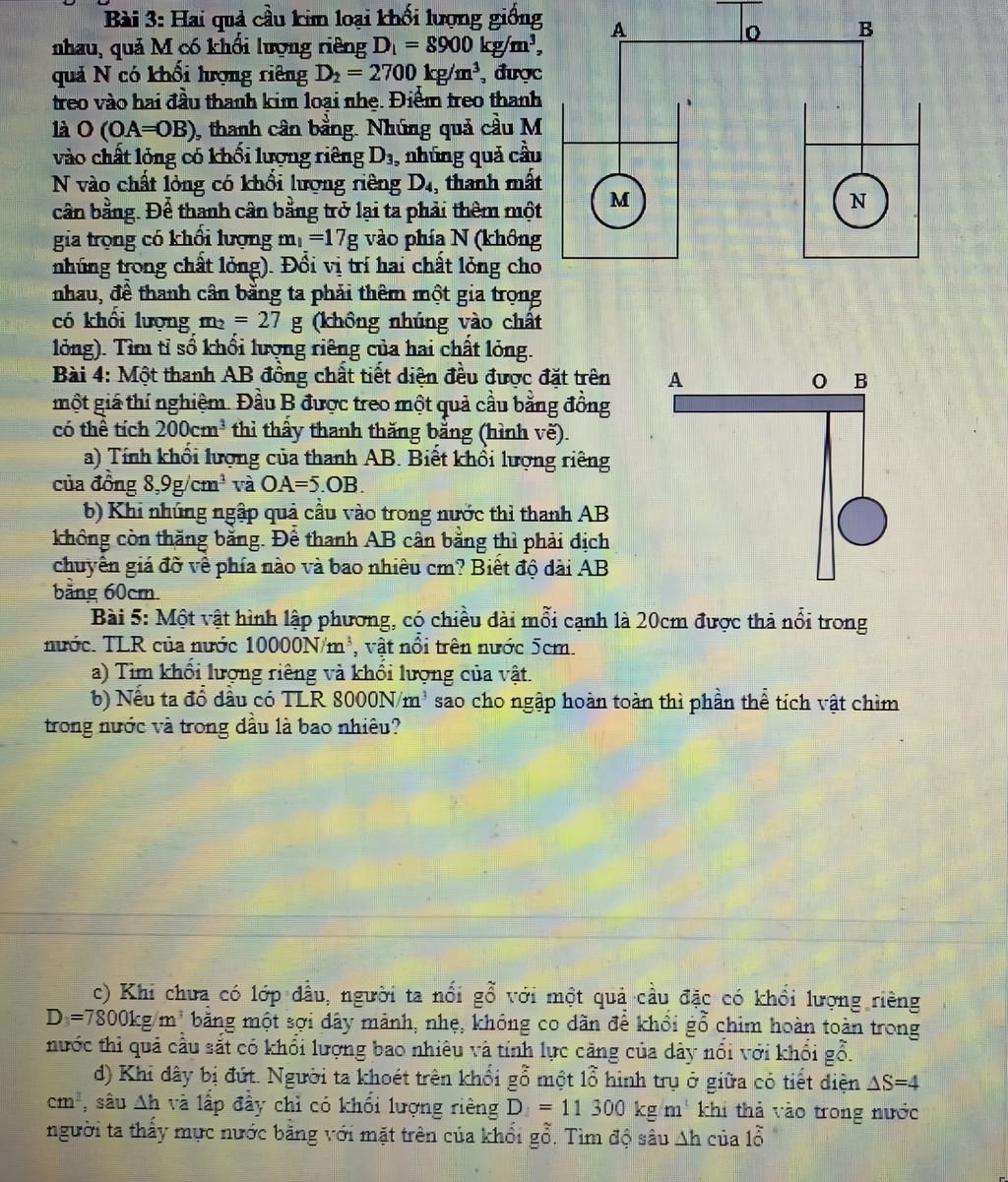 = 30 cm. Thanh AB mảnh, có khối lượng không đáng kể cân bằng năm ngang. Biết OA =OB trọng lượng riêng của nước là d = 10000 N/m3, tính khối lượng vật m1.