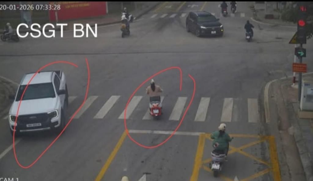 $\text{Xe máy}$ : Đã vượt quá vạch dừng đèn đỏ, lấn vạch kẻ đường dành cho người đi bộ.