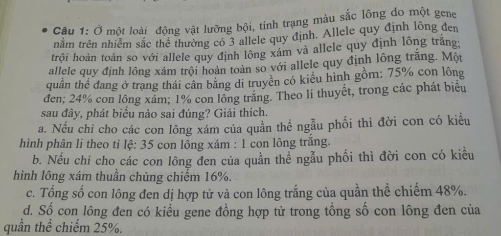 • Câu 1: Ở một loài động vật lưỡng bội, tính trạng màu sắc lông do một gene