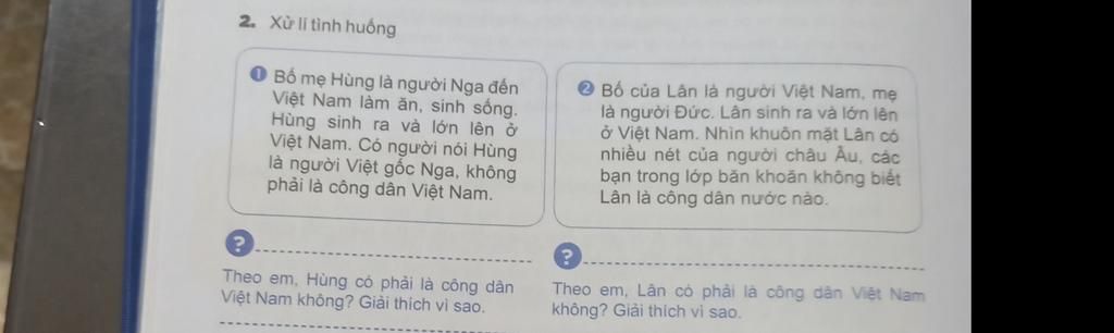 Tình huống 2: Lân là người Việt Nam bởi vì bố của Lân là người Việt Nam và Lân sinh ra tại Việt Nam. Theo thời đại hiện nay, quê bố là quê hương của mọi người nên Lân là người Việt Nam
