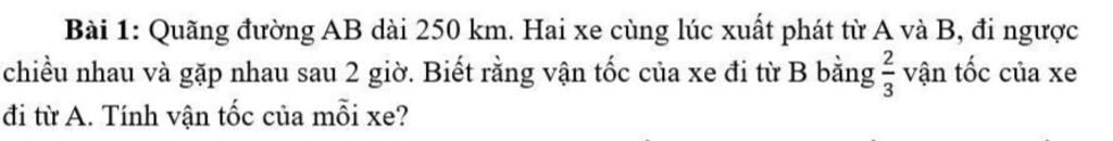 \begin{array}{|c|c|c|c|}\hline \text{...}&\text{Vận tốc (km/h)}&\text{Thời gian (h)}&\text{Quãng đường (km)}\\ \text{Xe từ A}&v_A&2&2 \times v_A\\ \text{Xe từ B}&v_B = \frac{2}{3}v_A&2&2 \times v_B\\ \text{Cả hai xe}&\text{Tổng vận tốc}&2&250\\\end{array}