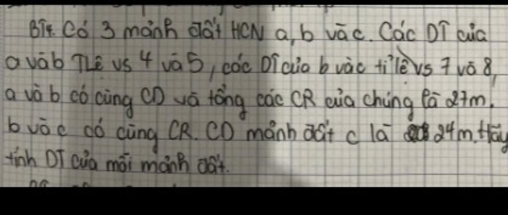 Gọi diện tích của `3` mảnh đất `a, b, c` lần lượt là `Sa, Sb, Sc (m^2)(Sa,Sb,Sc>0)`