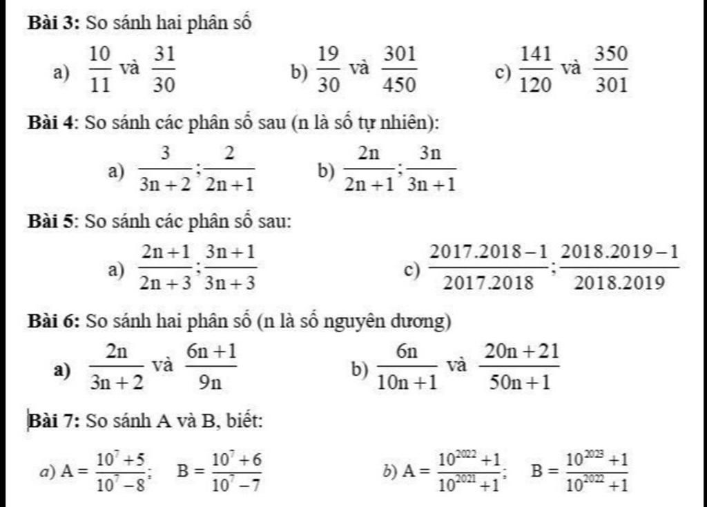 Bài 6: So sánh hai phân số. n là số nguyên dương.