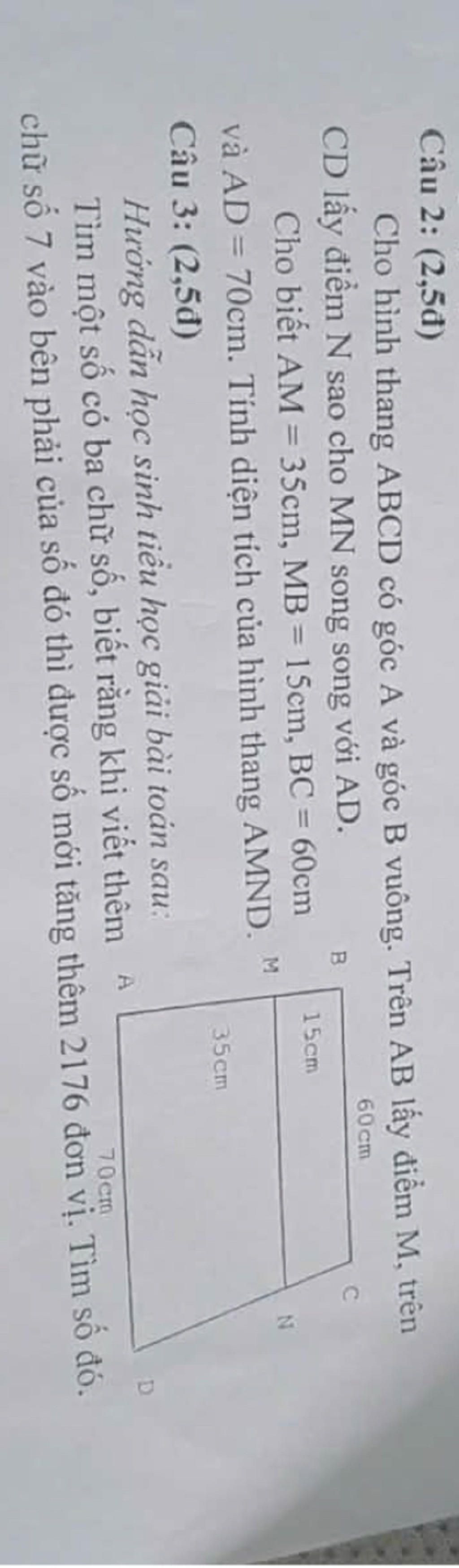 Diện tích hình thang AMND là:$\frac{(63 + 70) \times 35}{2} = 2327,5$ (cm²)