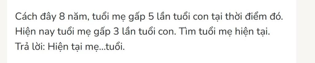 Cách đây `8` năm, tuổi mẹ gấp `5` lần tuổi con nên tuổi con bằng `1/4` hiệu tuổi hai mẹ con