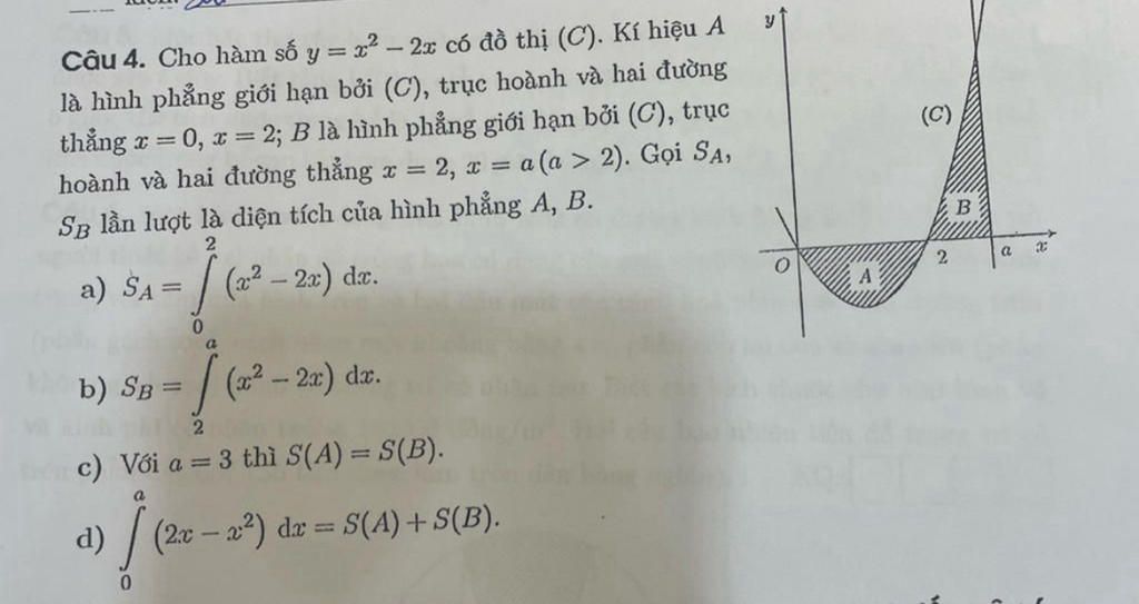 `a)` Do trên đoạn `[0; 2]` thì `x^2 - 2x <0` nên