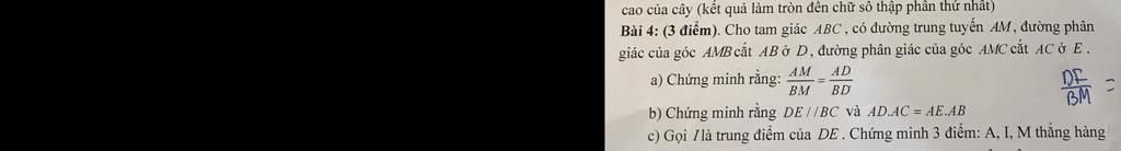giác của góc AMB cắt AB ở D, đường phân giác của góc AMC cắt AC ở E.