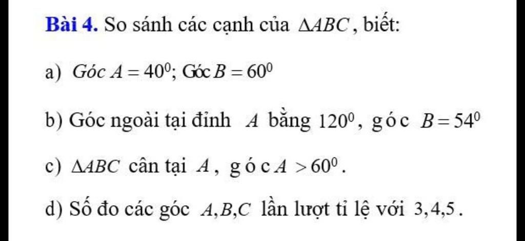 Bài 4. So sánh các cạnh của A4BC, biết: