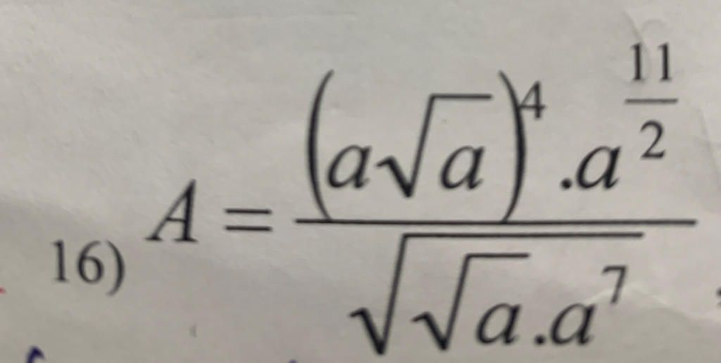 `A=((a*a^(1/2))^4 *a^(11/2))/(sqrt(a^(1/2) *a^7))`