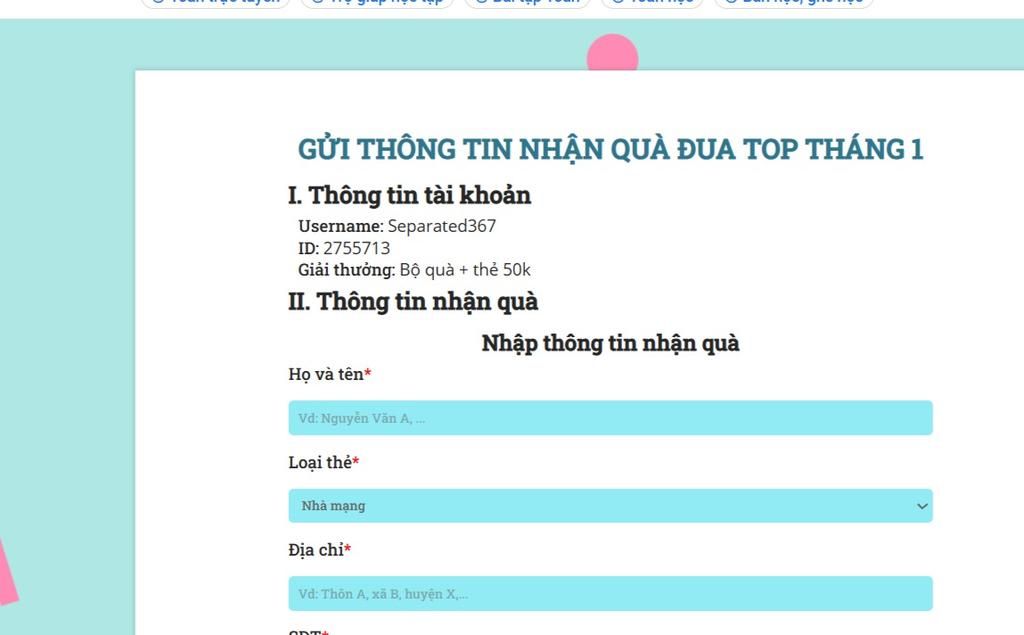 GỬI THÔNG TIN NHẬN QUÀ ĐUA TOP THÁNG 1