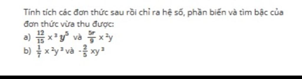 Tích của hai đơn thức là: `(12/15 x^3 y^5) * ((5r)/9 x^2 y) = (12/15 * 5/9) * (x^3 * x^2) * (y^5 * y) * r = 4/9 x^5 y^6 r`