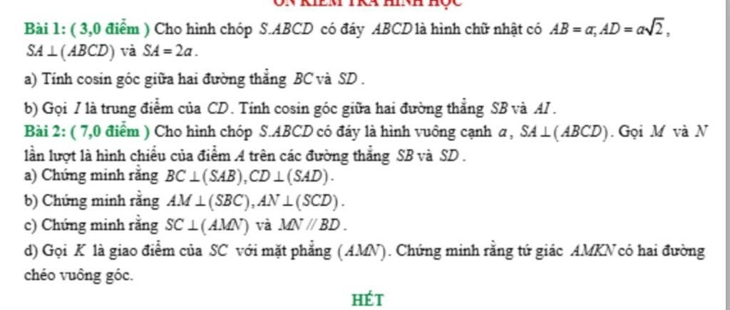 AB=a,AD=a2,SA⊥(ABCD),SA=2aAB = a,\quad AD = a\sqrt2,\quad SA \perp (ABCD),\quad SA = 2aAB=a,AD=a2,SA⊥(ABCD),SA=2a a) Tính cosin góc giữa BCBCBC và SDSDSD,b) Gọi III là trung điểm của CDCDCD. Tính cosin góc giữa SBSBSB và AIAIAI