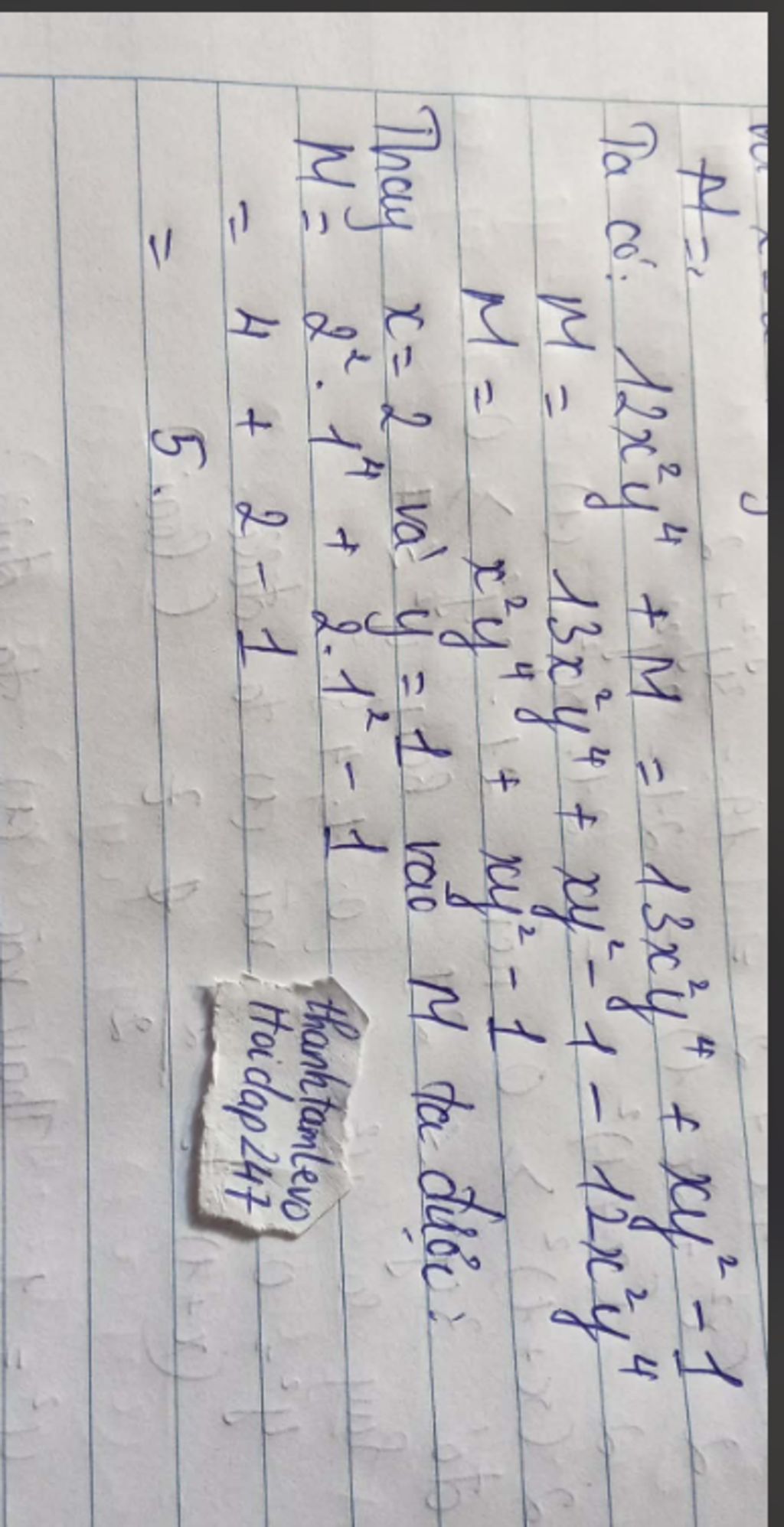Cho đa thức M thỏa mãn 12x2y4 + M = 13x2y4 + xy2 - 1. Giá trị của đa thức M tại x = 2; y = 1 là