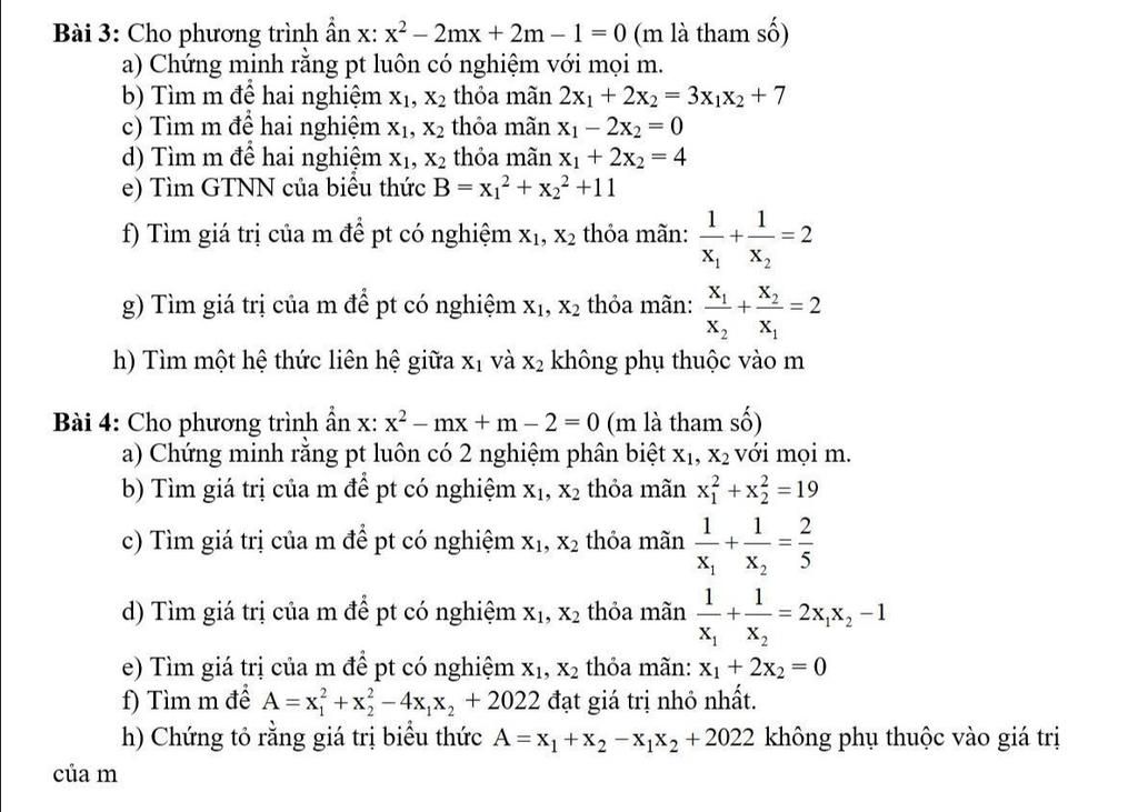 & \text{Theo Vi-ét: } \begin{cases} x_1 + x_2 = m \\ x_1x_2 = m - 2 \end{cases} \\