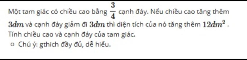 Chiều cao sau khi tăng thêm $3dm$ là: `\frac{3}{4}x + 3` ($dm$).