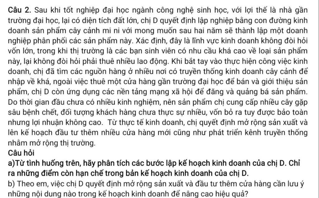 `a.` Chị `D` đã lập kế hoạch kinh doanh với các bước cơ bản như xác định ý tưởng kinh doanh cây cảnh mini, phân tích điều kiện thuận lợi, xác định thị trường mục tiêu là sinh viên, tìm nguồn hàng và quảng bá sản phẩm qua cửa hàng và mạng xã hội. Tuy nhiên, kế hoạch còn hạn chế do thiếu kinh nghiệm, chất lượng sản phẩm chưa ổn định, khách hàng ít và lợi nhuận chưa cao nhưng đã vội mở rộng sản xuất, tiềm ẩn rủi ro.
