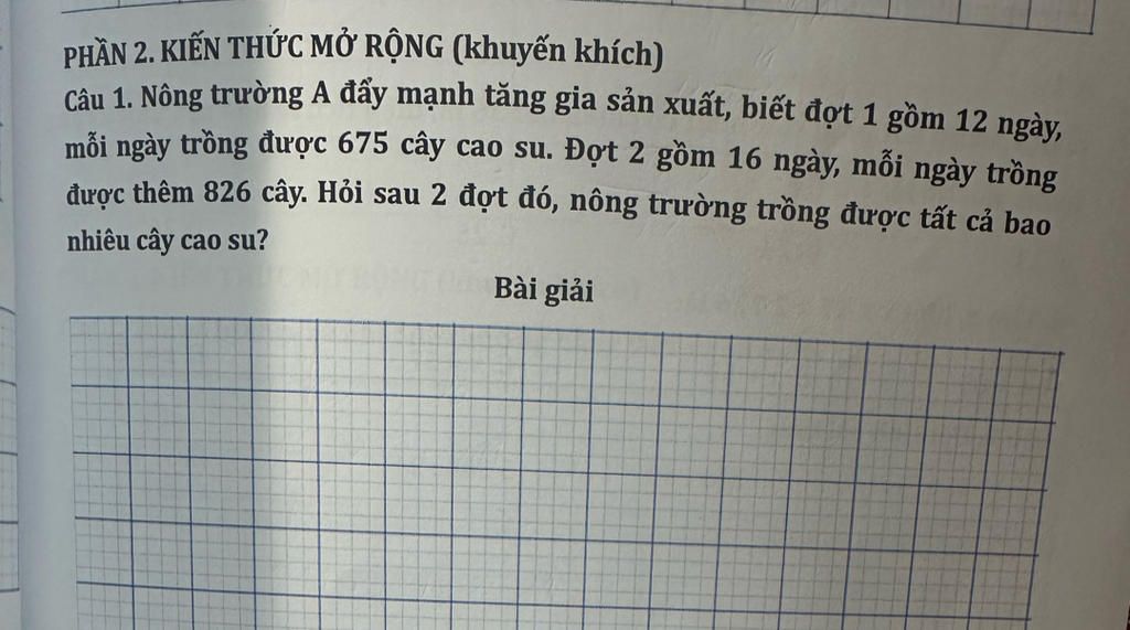 Số cây cao su nông trường trồng được trong đợt 1 là: $675 \times 12 = 8100$ (cây) Số cây cao su trồng được mỗi ngày trong đợt 2 là: $675 + 826 = 1501$ (cây) Số cây cao su nông trường trồng được trong đợt 2 là: $1501 \times 16 = 24016$ (cây) Tổng số cây cao su nông trường trồng được sau 2 đợt là: $8100 + 24016 = 32116$ (cây) Đáp số: $32116$ cây cao su. Rút gọnSố cây cao su nông trường trồng được trong đợt 1 là: $675 \times 12 = 8100$ (cây) Số cây cao su trồng được mỗi ngày trong đợt 2 là: $675 + 826 = 1501$ (cây) Số cây cao su nông trường trồng được trong đợt 2 là: $1501 \times 16 = 24016$ (cây) Tổng ... xem thêm