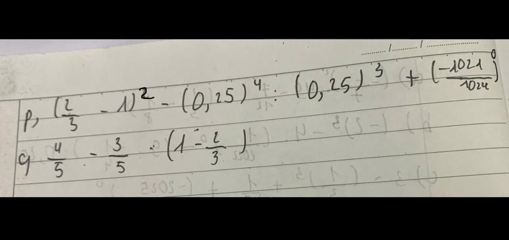 `p)` `(2/3 - 1)^2 - (0,25)^4 ÷ (0,25)^3 +((-1021)/(1024))^0`