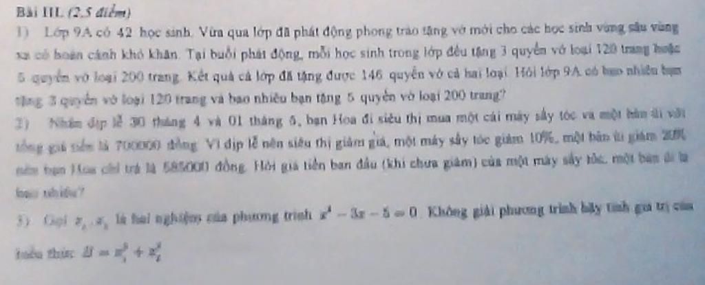 1) Lớp 9A có 42 học sinh. Vừa qua lớp đã phát động phong trao tặng vợ mới cho các học sinh vàng, sâu vùng