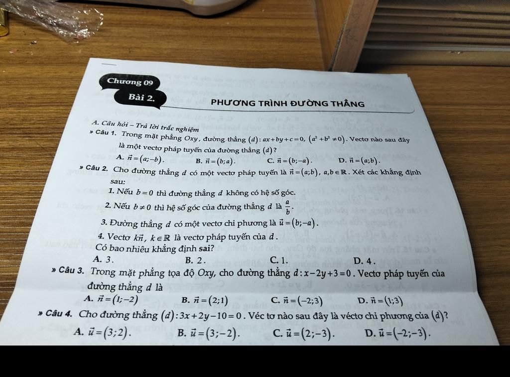 Lý thuyết: Đường thẳng $ax + by + c = 0$ có VTPT là $\vec{n} = (a; b)$.