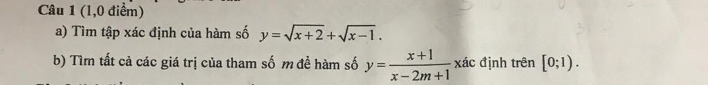 `b)` `y=(x+1)/(x-2m+1)` xác định trên `[0;1)`