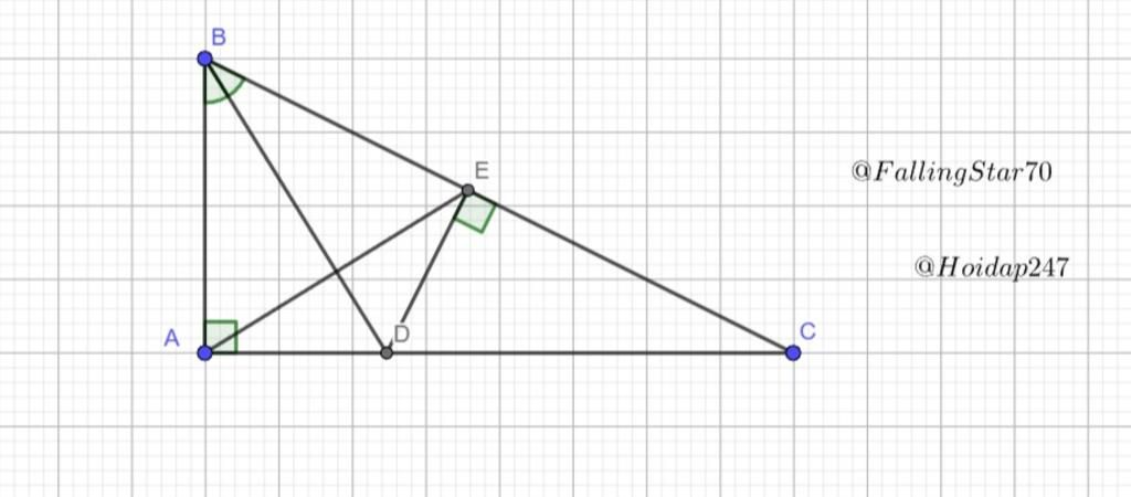 Ta có `BD` là tia phân giác `hat{ABC}` `=>` `hat{ABD} = hat{EBD}`