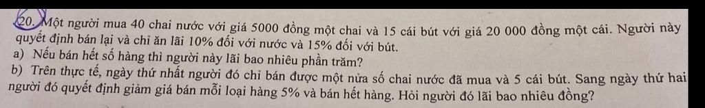 20. Một người mua 40 chai nước với giá 5000 đồng một chai và 15 cái bút với giá 20 000 đồng một cái. Người này