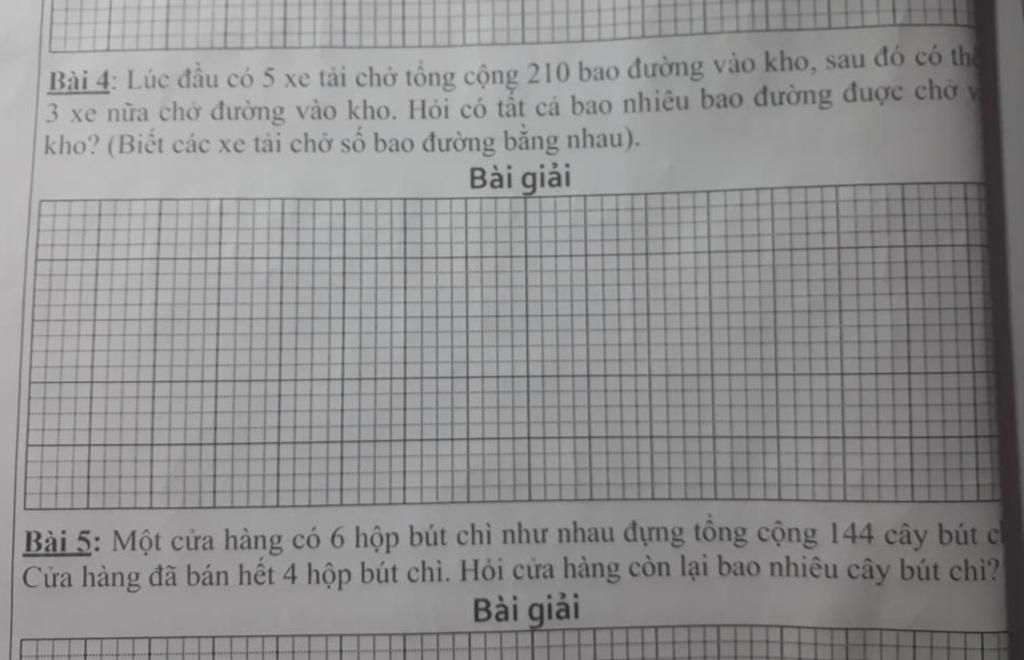 Giải thích các bước giải:Mỗi xe đường chở số bao là 210:5=42(bao)