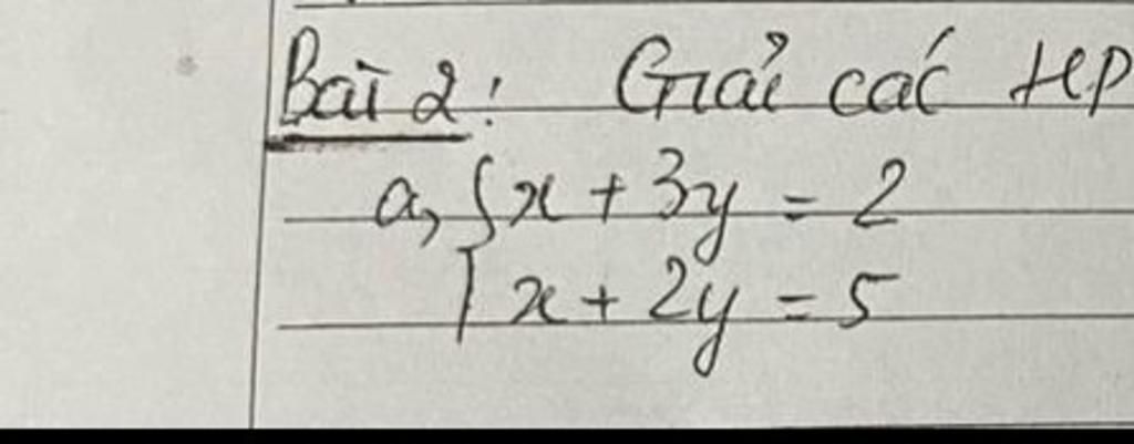 `a)` `{(x + 3y = 2), (x + 2y = 5):}`