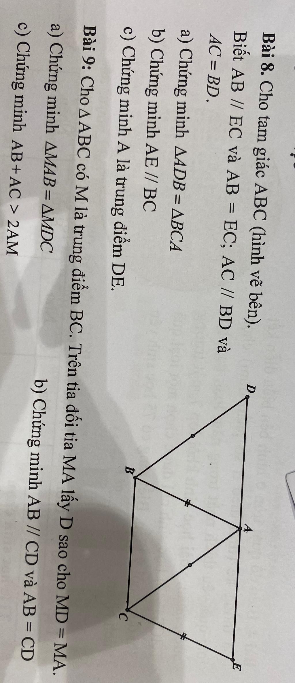 Bài 9: Cho AABC có M là trung điểm BC. Trên tia đối tia MA lấy D sao cho MD = MA.