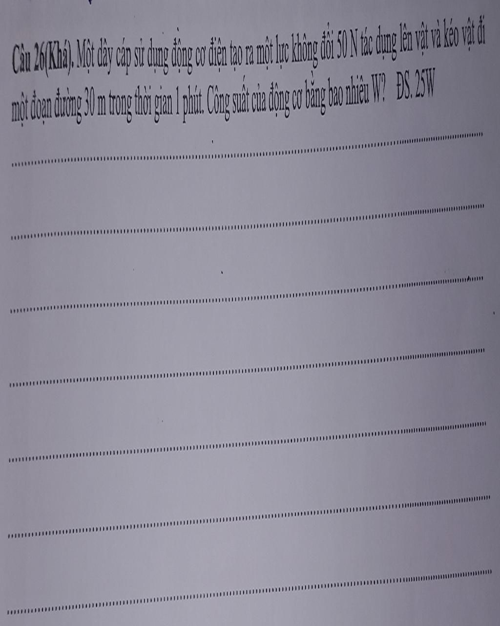 `P=A/t=[F*s*cos\alpha]/t = [50*30*cos0^@]/60 = 25 W`