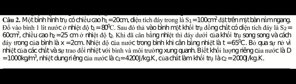 Đổ vào bình 1 lít nước ở nhiệt độ t1=80C. Sau đó thả vào bình một khối trụ đồng chất có diện tích đáy là S2=