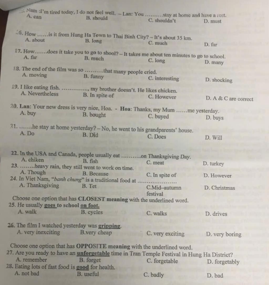 Nam :I'm tired today, I do not feel well. - Lan: You..........stay at home and have a rest.
