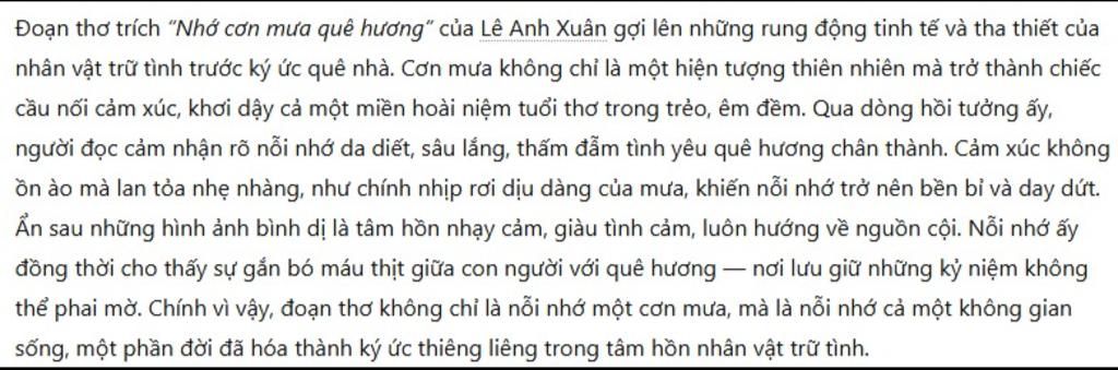 viết đoạn văn nghị luận cảm nhận cảm xúc của nhân vật trữ tình ở đoạn thơ trích '' Nhớ cơn mưa quê hương '' của tác giả Lê Anh Xuân ( SOS cần trc ngày 20/2 5 sao hứa )