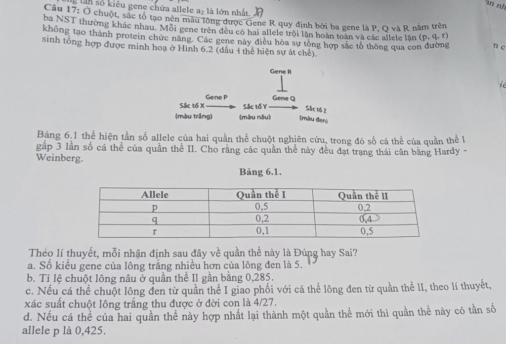 Câu 17: Ở chuột, sắc tố tạo nên màu lông được Gene R quy định bởi ba gene là P, Q và R nằm trên