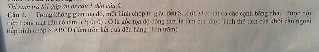 Trong không gian toạ độ, một hình chóp tứ giác đều S. ABCD có tất cả các cạnh bằng nhau được nội