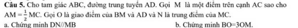 Câu 5. Cho tam giác ABC, đường trung tuyến AD. Gọi M là một điểm trên cạnh AC sao cho